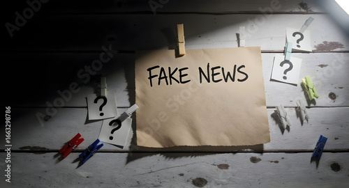 The Concept of Fake News Illustrated with Paper, Question Marks, and Clothespins on a Wooden Surface.
