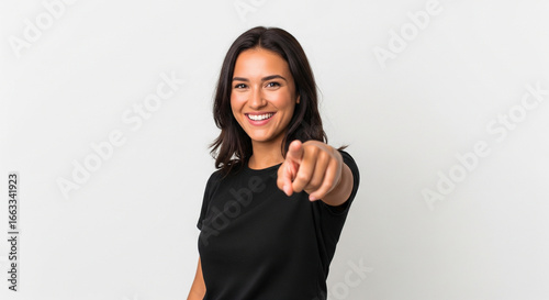 A confident young woman with a warm smile pointing directly at the camera, inviting interaction or selection from the viewer, on a clean white background