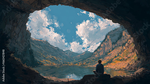Young man contemplating his journey under a cave's mouth facing a gorgeous mountain view (2)