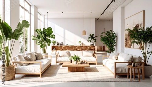 Minimalist lifestyle interior with clean white walls, indoor plants, and sleek furniture arranged in perfect harmony.