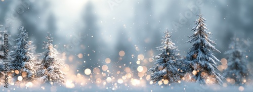 Snowy winter forest with frosted pine trees and glittering bokeh