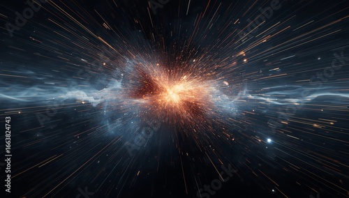 A massive celestial explosion bursts with fiery light and energy, sending sparks through a cosmic nebula.