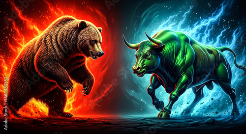Fiery bull vs. icy bear symbolizing market volatility and the eternal struggle between optimism and pessimism in finance