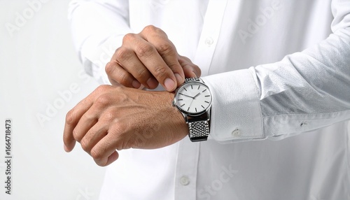 腰下・手元クロップで、シャツのカフスを見せながら腕時計を調整する手元の構図です。背景はクリーンな白で、洗練された印象を与えます。