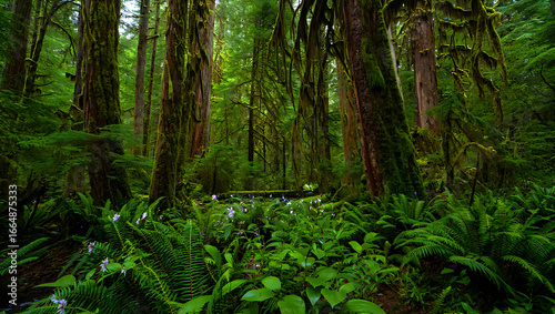 A lush and verdant temperate rainforest floor, teeming with ferns and mosscovered trees, creates a magical and ancient woodland scene