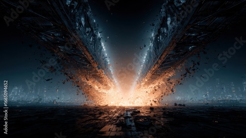 Futuristic city destruction fiery V-shaped rift