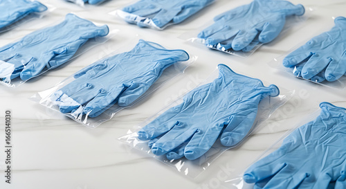 Multiple blue surgical gloves in clear plastic packaging arranged on a white surface in a pattern