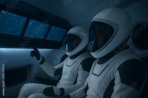 Astronauts in pristine white suits meticulously operate advanced digital control panels within a futuristic spacecraft cabin, preparing for an upcoming mission into the vast expanse of space