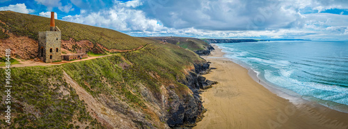 Ruins of a tin mine on the Cornish coast overlooking sandy beach and sea