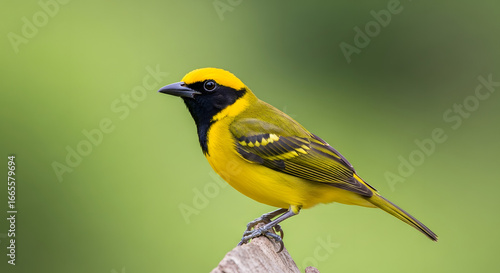 Brilliant Golden Oriole bird with black face and breast perched on a branch, showcasing its striking plumage against a soft green bokeh background in its nature habitat creating vibrant imagery