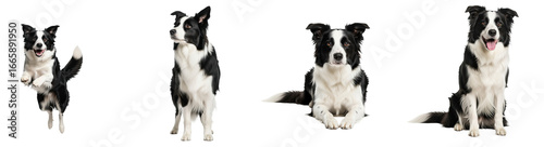 Border collie dog in various poses showing playful, attentive, and calm expressions with black and white fur coat