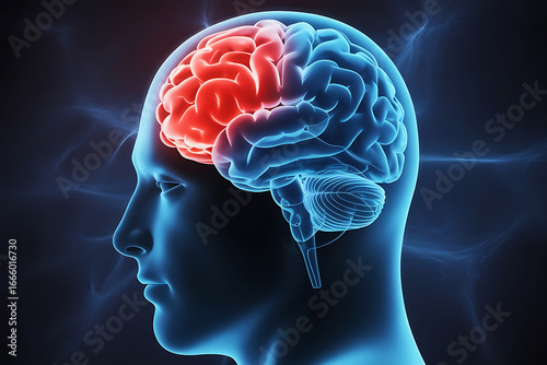 3d side profile medical rendering of the human brain with frontal lobe highlighted showing cognition planning memory and neural connections for neurology healthcare and education
