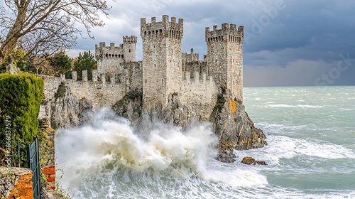 Ancient stone castle perched a cliff overlooking a turbulent sea cinematic medieval grandeur