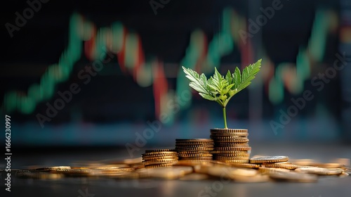Green Plant Growing from Stack of Coins with Stock Market Background, Symbolizing Investment and Financial Growth