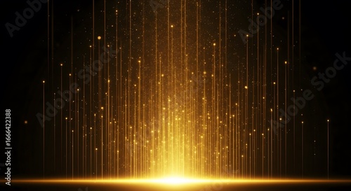 Abstract background with golden light rays and sparkling particles rising up. A concept of award, magic, luxury, and celebration with an elegant glitter effect.