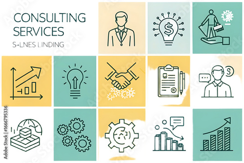 Consulting services icons arranged in a grid pattern on a light green and yellow background