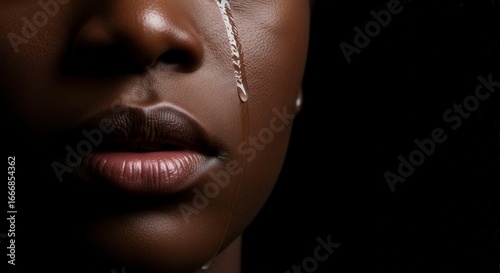 Close up portrait of african american woman with tears on face in dark studio setting emotional sadness violence against women.