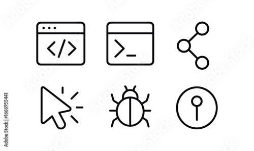 vector outline icons digital workspace setup (coding station): code editor terminal prompt Git icon pair cursor bug marker commit badge.