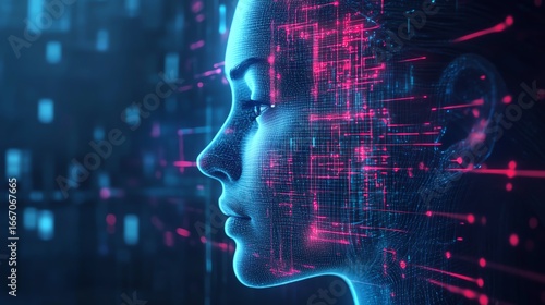 #746890738Digital face with glowing neon grid and futuristic light effects image