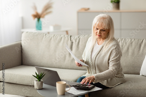 Budgeting, Paying Bills At Home Online During Covid-19 Pandemic. Portrait of focused mature lady working with documents and laptop sitting on couch in living room and calculating family taxes