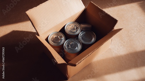 Open cardboard box with canned goods packaging storage food industry distribution concept