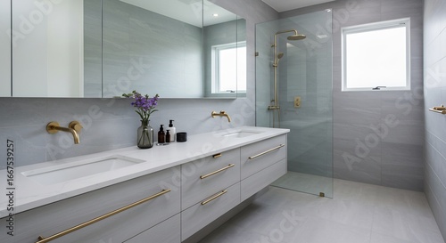 洗練されたグレーのタイル 輝く金具 広々としたモダンなバスルーム. AI Generated