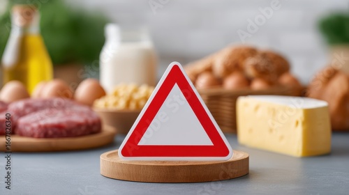 A warning sign and processed food symbolizing the dangers of consuming processed foods that cause various health problems, including carcinogens.