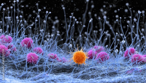 Microscopic view of cells and fungal hyphae. A vibrant orange cell stands out amidst a field of pinkish-purple cells and light-blue fungal filaments. Dark background