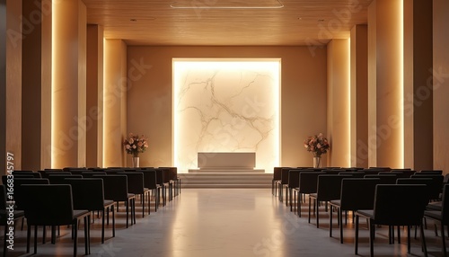 Modern crematorium with marble altar, soft lighting. Rows of black chairs face altar, with flower arrangements on side. Serene space designed for funeral ceremonies, memorial services, quiet