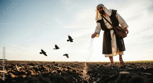 Man sower scattering seeds on cultivated land while birds fly near a field with fertile soil. Gospel story of Jesus Christ parable about the sower.