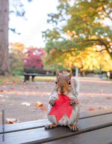 A plump gray squirrel sits on a park bench, holding a vibrant red leaf in its paws, surrounded by autumnal scenery.