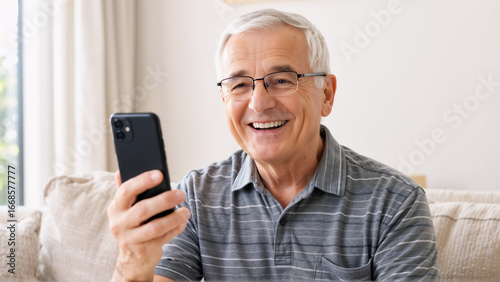 Szczęśliwy senior rozmawiający przez telefon komórkowy w domu