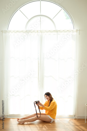 #1761743267Young woman enjoying a relaxed weekend at home with a smartphone in a cozy and bright living room.