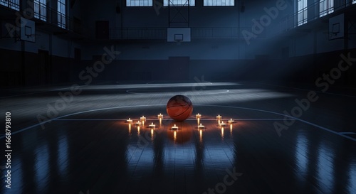 A basketball sits at center court, surrounded by a ring of flickering candles. The hushed gym and solemn light create a powerful memorial, paying tribute to a player's lasting legacy on the court.