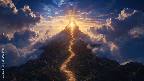 Cinematic 3D render of a rugged mountain crossroads under a dramatic sky, one road highlighted by amber sunbeams