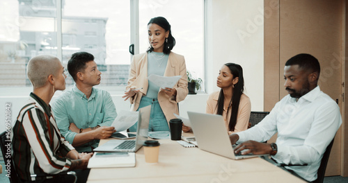 Business people, meeting and document with laptop for task, delegation or brainstorming at office. Group of employees, strategy discussion and technology with paperwork for project management or idea