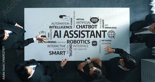 A modern business team discusses innovative AI assistant technologies in a sleek workspace, highlighting collaboration and strategic planning for future advancements. Amity