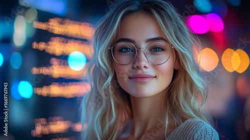A stylish portrait of a young blonde woman in thin-framed glasses against the background of bright, multicolored bokeh lights of the night city. Her soft gaze and trendy image are ideally suited to il