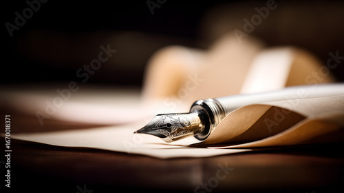 Elegant silver fountain pen on rich walnut desk in law office with warm lighting and leather pad. Professional legal atmosphere for consulting services, contracts and authoritative business.