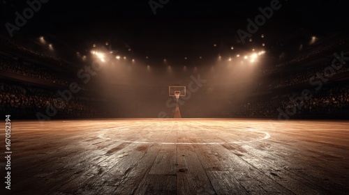 Empty stage with dramatic lighting and wooden floor in a dark theater setting
