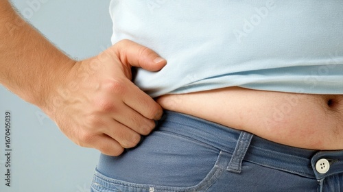 A person pinching belly fat above jeans, illustrating weight gain or body fat.
