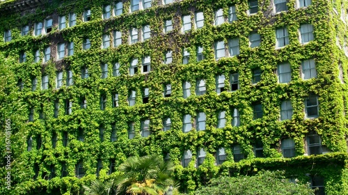 Building surrounded by the green leaves of a climbing Boston Ivy plant. Downtown Vancouver, British Columbia, Canada