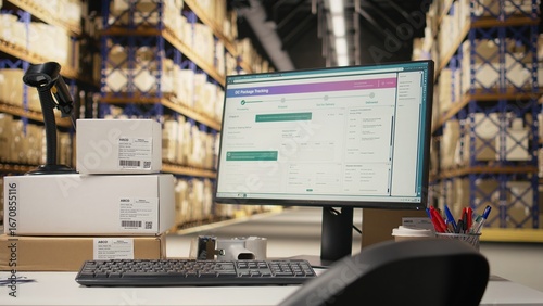 Empty distribution hub with big industrial storage racks filled with packages for large scale e-commerce operations. Space designed for fast delivery, product packaging and order processing.