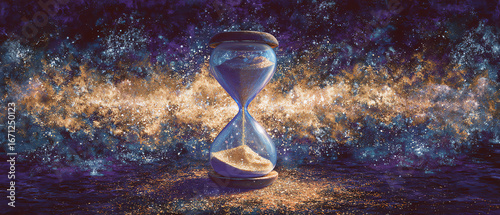 Hourglass in a cosmic background with sparkling stars