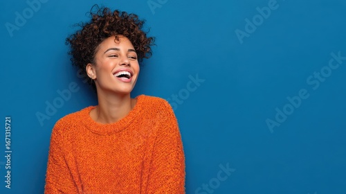 happy emotions concept positive dark skinned beautiful young woman laughs poisitively looks aside with carefree face expression wears casual orange sweater isolated over blue studio background no log