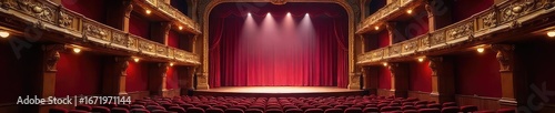A grand, ornate theater interior, empty stage bathed in soft light, plush velvet seating visible, ready for a performance , opera, architecture, theatrical