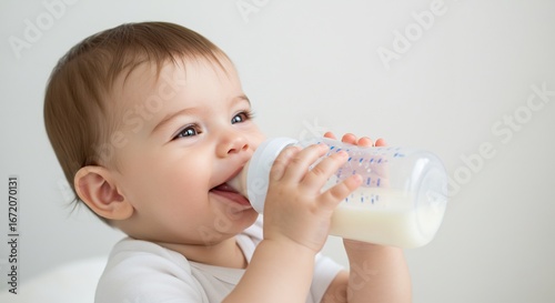 笑顔輝く赤ちゃん ミルクを飲む幸せな瞬間 柔らかな光が優しく包む. AI Generated