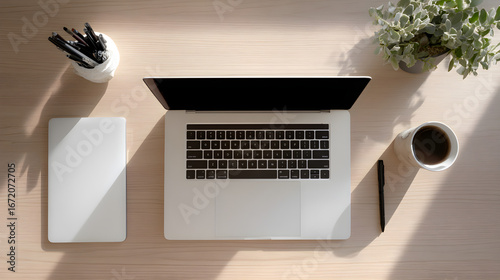 Neutral minimalist workspace with closed laptop and stylus, organized creative environment --ar 16:9