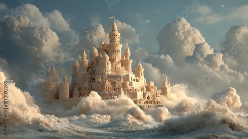 A majestic castle stands tall amidst swirling clouds, casting a magical glow over the serene seascape.