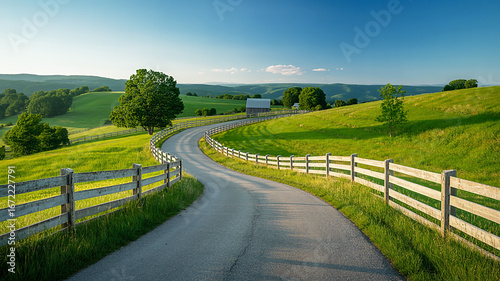A picturesque winding country road meanders through vibrant green rolling hills under a clear blue sky, inviting a scenic journey into the serene landscape